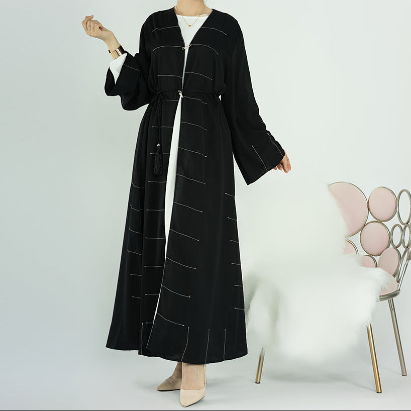 Style: Open Front Abaya featuring Elegant Thread Work and a Secure Pin Closure