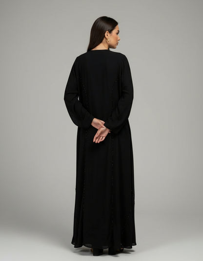 Open-front abaya with button closure, hand-beaded details, and a coordinating hijab.