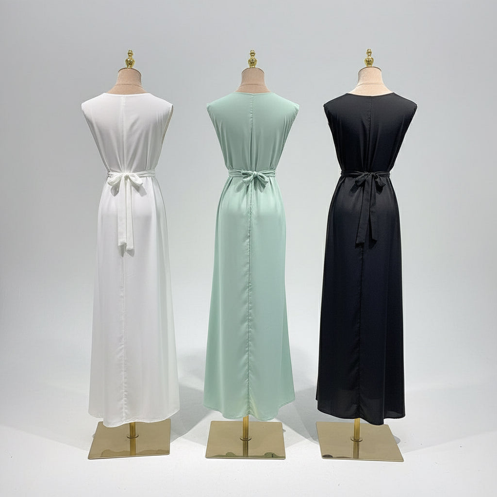 Sleeveless Nida Inner Dress is crafted from authentic, high-grade Nida fabric, offering a luxurious matte finish and a buttery-soft feel against the skin. Designed with a clean A-line silhouette and a modest neckline, it provides full coverage without the bulk—making it the ideal base for open abayas, sheer kaftans, or longline cardigans. Breathable, opaque, and wrinkle-resistant for all-day elegance.
